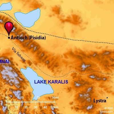 You are free to use up to 50 Biblos coprighted maps (small or large) for your website or presentation. Please credit Biblos.com. Occurrences Acts 13:14 But they, passing on from Perga, came to Antioch of Pisidia. They went into the synagogue on the Sabbath day, and sat down. Acts 14:19 But some Jews from Antioch and Iconium came there, and having persuaded the multitudes, they stoned Paul, and dragged him out of the city, supposing that he was dead. Acts 14:21 When they had preached the Good News to that city, and had made many disciples, they returned to Lystra, Iconium, and Antioch, 2 Timothy 3:11 persecutions, and sufferings: those things that happened to me at Antioch, Iconium, and Lystra. I endured those persecutions. Out of them all the Lord delivered me. Encyclopedia ANTIOCH, OF PISIDIAan'-ti-ok, pi-sid'-i-a (Antiocheia pros Pisidia, or aAntiocheia he Pisidia = "Pisidian").